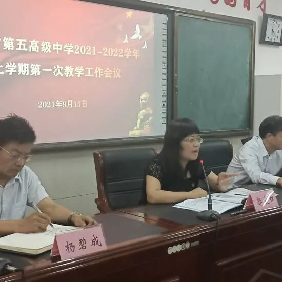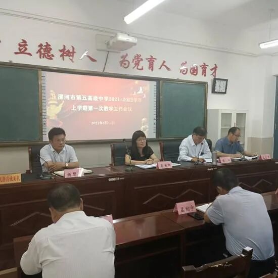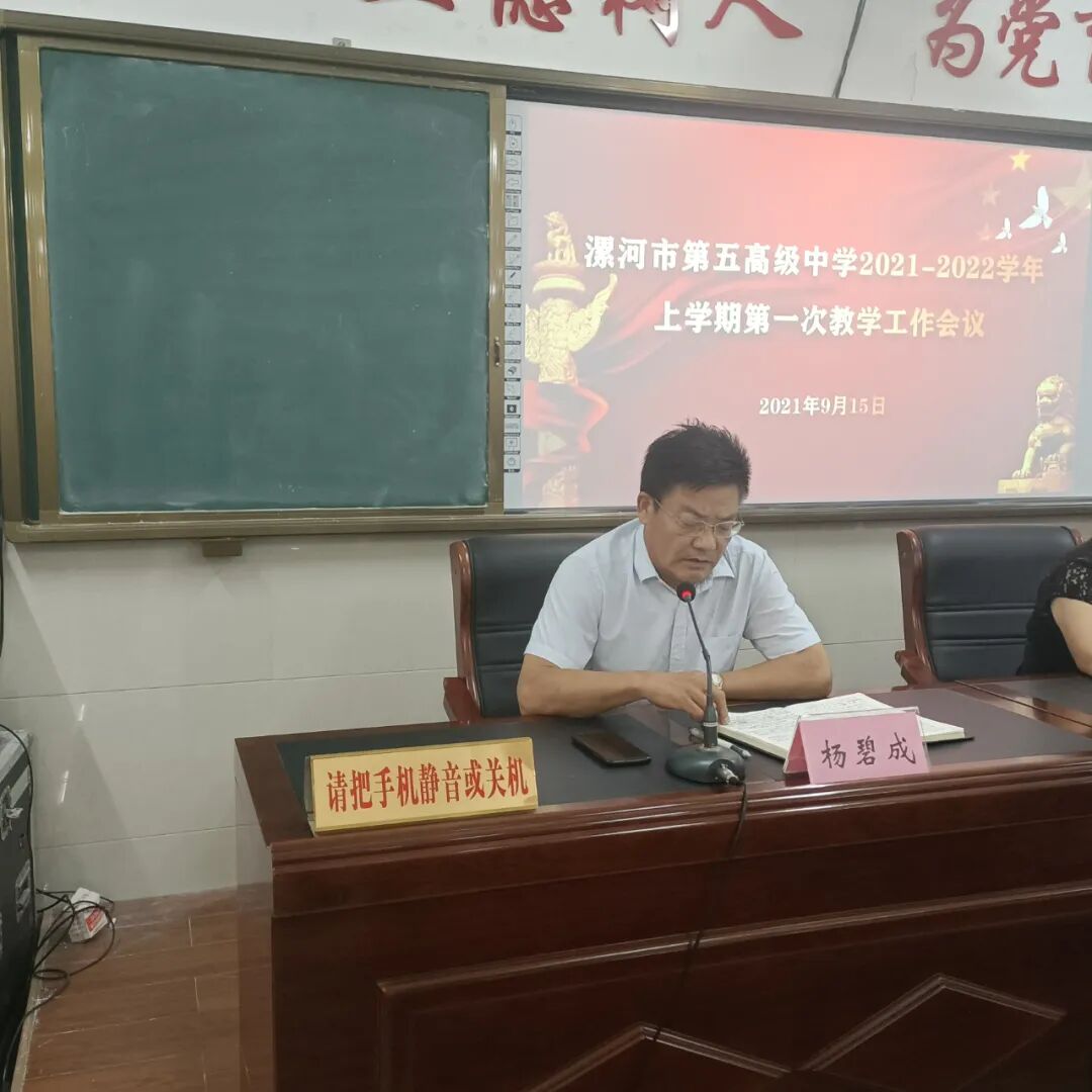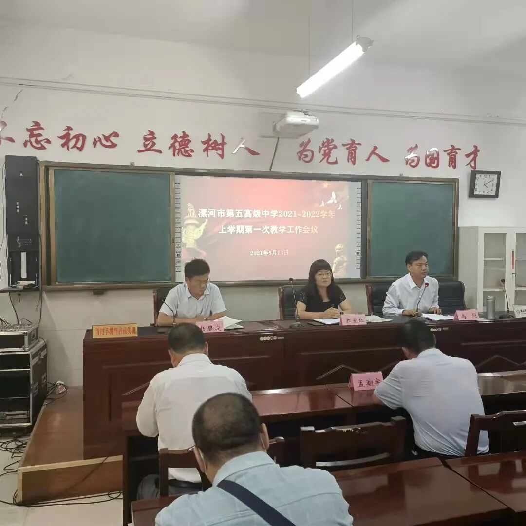 又是一年丹桂飘香季,最是教育好时节。为稳步提高学校教育教学质量,圆满完成新学期教育教学任务,9月15日下午,漯河市第五高级中学2020-2021学年上学期第一次教学工作会议在综合楼103室召开。漯河五高校长郭爱红带领全体校领导出席了此次会议。 首先,教务处副主任李敬业汇报新学期教学工作安排情况。本学期继续抓好各项常规教学检查,抓好集体备课,抓好周公开课,抓好作业批改与检查,抓好教案和观课记录的检查,抓好青年教师业务培养,强化各年级备课组的团队建设。坚定不移地推进常规教学,积极探索有效教学课堂改革,不动摇,不折腾,不懈怠。 接着,高一年级主任姚广强、高二年级主任孔忠臣、高三年级主任杨铁虎分别就本年级工作安排进行了汇报。他们分别从教学工作、师德师风工作等各个方面提出了符合本年级发展的学期规划。他们都特别强调了紧握学校教学常规,加强学校教师培养,齐心协力共同促进漯河五高的发展。随后,副校长杨碧城对新学期教学工作做出部署及要求,他强调继续加强师德师风建设的重要性,进一步落实集体备课制度,强化教学常规的检查和督导,狠抓考试质量与考试时效性,搞好评教活动,各年级制定切实可行的培优方案等促进我校教学工作再上新台阶。