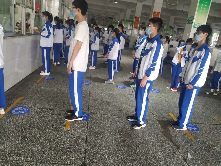 疫情期间,学校实施错时就餐、定位就餐、无声就餐、文明就餐,杜绝面对面就餐。在食堂入口处设置体温测量点,售卖窗口前设置一米线,提醒学生间隔距离选餐。为保证用餐时堂食学生间的安全距离,我们将餐桌进行临时改造,在凳子上张贴就餐位,还在餐桌上摆放了班级就餐位置牌。