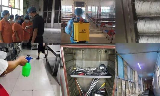 学校坚持每日对食堂进行全方位卫生检查,对餐具、炊具、灶台在每日三餐后进行彻底地高温消毒;餐厅地面打扫后,还要使用84消毒液进行消毒;售饭间还要用紫外线进行消毒。